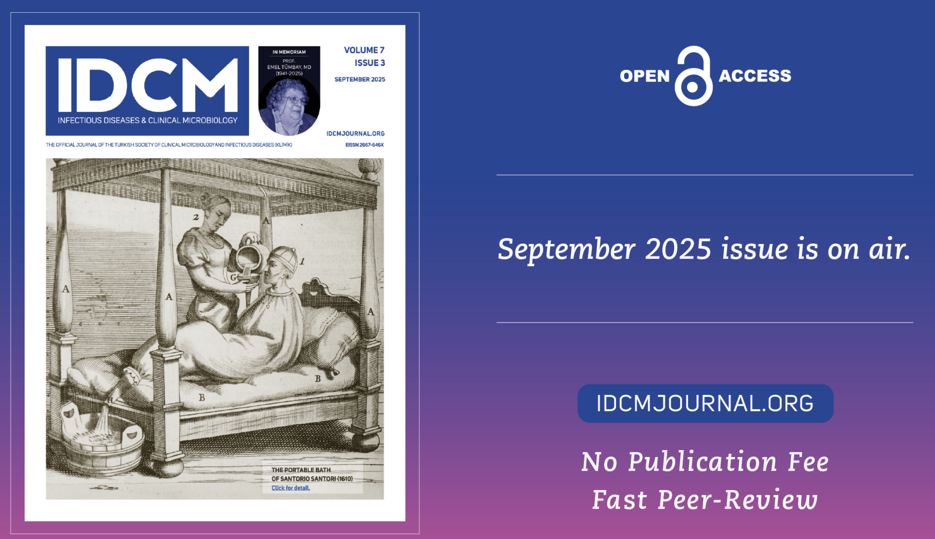 KLİMİK Derneğinin İngilizce yayın organı olan IDCM Dergisinin September 2025 sayısı yayınlandı. Dergi, yayına kabul edilen makaleler için hiçbir basım-yayın ücreti talep etmiyor. IDCM dergisi halen PubMed, Scopus, Emerging Science Citation Index (ESCI) ve TÜBİTAK-ULAKBİM tarafından indekslenmekte. Derginin bu sayısında, kısa süre önce kaybettiğimiz ve ülkemizde Tıbbi Mikoloji Bilim Dalının kurucularından olan Prof. Dr. Emel Tümbay'ın anısına hazırlanmış bir makaleyi de okuyabilirsiniz.